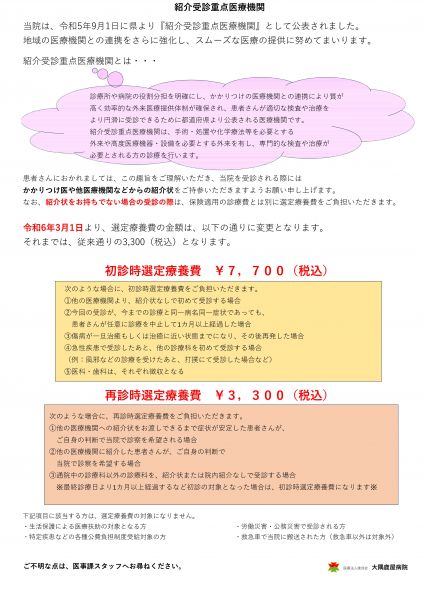 患者さんにおかれましては、この趣旨をご理解いただき、当院を受診される際にはかかりつけ医や他医療機関などからの紹介状をご持参いただきますようお願い申し上げます。